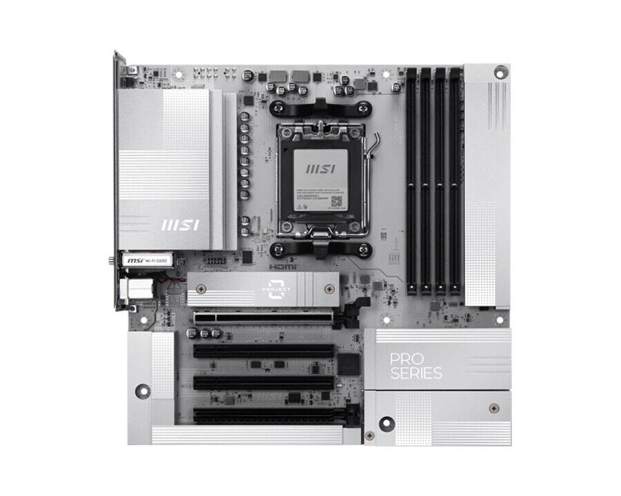 PRO B850M-A WIFI PZ offers a sleek design with a harmonious silver-white color scheme that perfectly matches white PC builds. Its innovative back-connect design reduces the complexity of cable management, resulting in an aesthetically pleasing appearance for the system. It is engineered with many exclusive features of MSI, Wi-Fi 7 with EZ Antenna, 5G LAN, PCIe 5.0 M.2, and Supplemental PCIe Power, ready for the AMD Ryzen™ 9000 series processors.