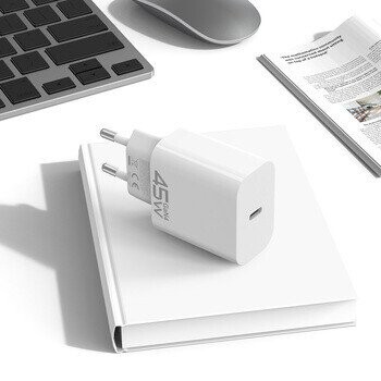 USB Type-C PD 45W Port Equipped with a 45W USB Type-C port, it allows fast and stable charging of smartphones, tablets, laptops, and other mobile devices. Advanced GaN4 Technology The latest 4th generation GaN technology ensures higher energy efficiency, reduced heat generation, and a more compact design. Comprehensive Safety Protection The charger is equipped with multiple protections: Over-Temperature (OTP), Short-Circuit (SCP), Over-Voltage (OVP), and Over-Current (OCP), ensuring safe and stable charging for all your devices. High-Quality PC Material Made of flame-retardant PC material with UL94V-0 fire resistance level, providing durability and reliability for everyday use. Compact Size With slim dimensions (82 × 43 × 26 mm), the charger is easy to carry and perfect for use at home, in the office, or while traveling. Specifications: