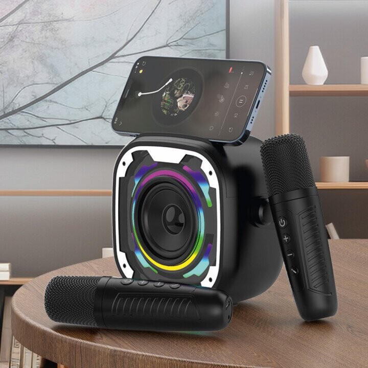- Phone stand – The speaker features a convenient holder for placing your smartphone during karaoke or music playback.